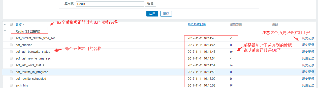#点击此主机的监控项选择Redis应用集,可以看到我们设置的自动发现规则里面的监控项原型生效了。一共两页82行。