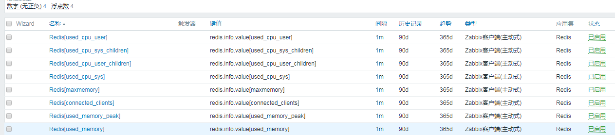 # /usr/local/zabbix/bin/zabbix_get -s 192.168.14.55 -k redis.info.value[used_cpu_user] #取值是可以的,有浮点数