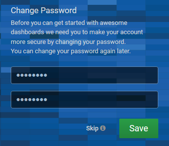 在那里,将看到登录页面。 默认用户名为admin,默认密码为admin。 当第一次登录时,系统会要求您更改密码。 建议您遵循Grafana的最佳做法并更改默认管理员密码。 可以稍后转到用户首选项并更改用户名。