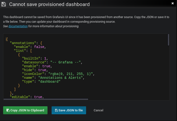 可以在Grafana UI中对配置的仪表板进行更改,但目前无法自动将更改保存回配置源。 但是,如果您对配置的仪表板进行了更改,则可以保存仪表板,这将显示无法保存配置的仪表板对话框,如下面的屏幕截图所示。 此处提供的选项可让您将JSON复制到剪贴板和/或将JSON保存到文件,这可以帮助您将仪表板更改同步回配置源。